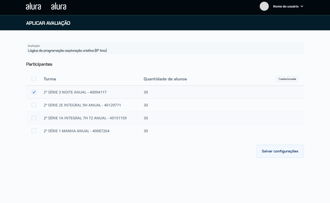 - Marque a turma para a qual deseja aplicar a avaliação e clique em “Salvar configurações”.