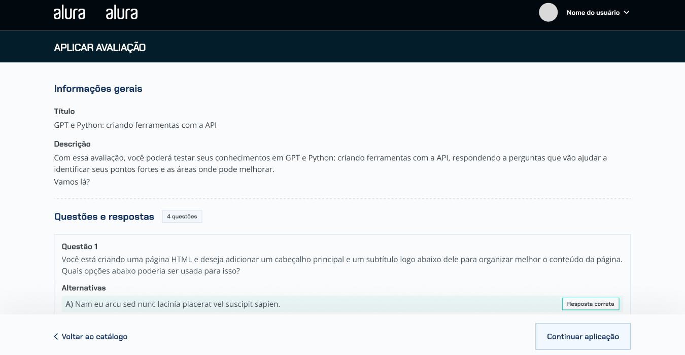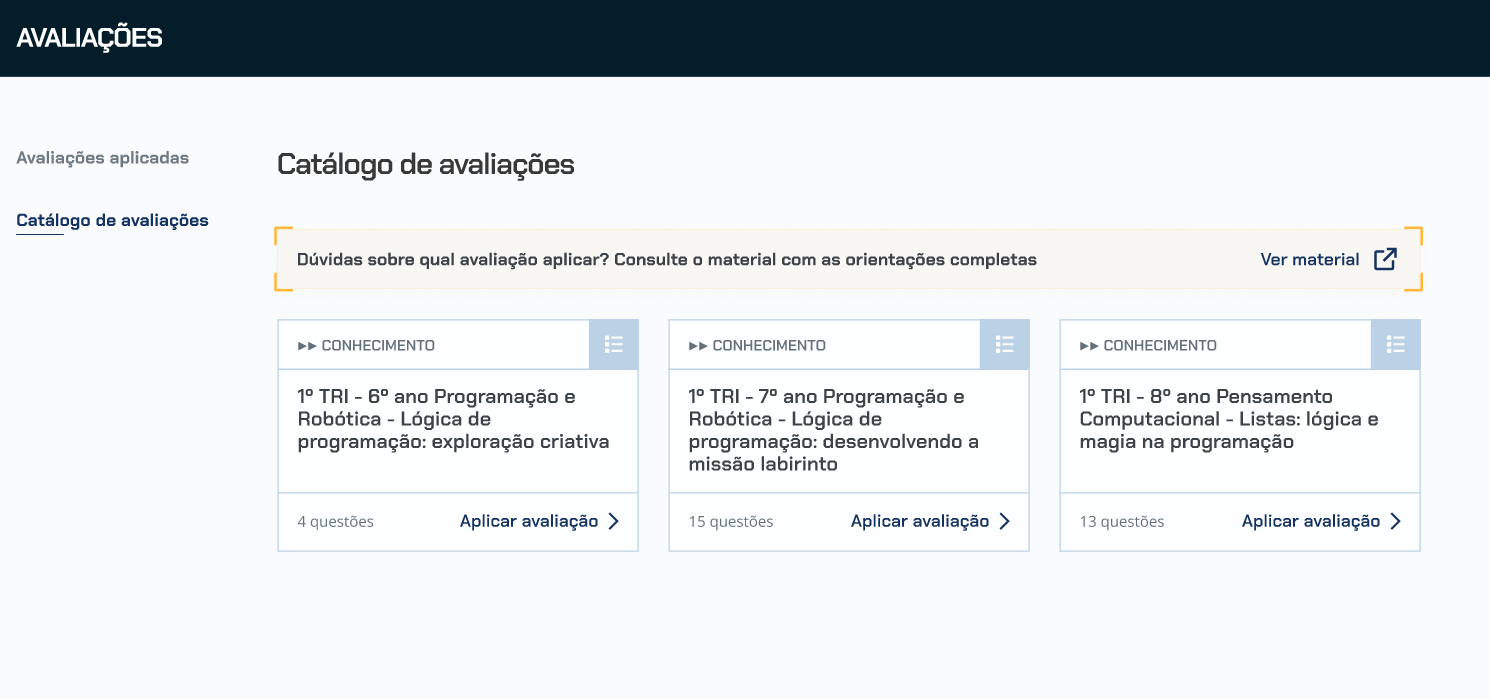 - No menu “Catálogo de avaliações”, você encontrará todas as avaliações de unidades disponíveis para as turmas ministradas.