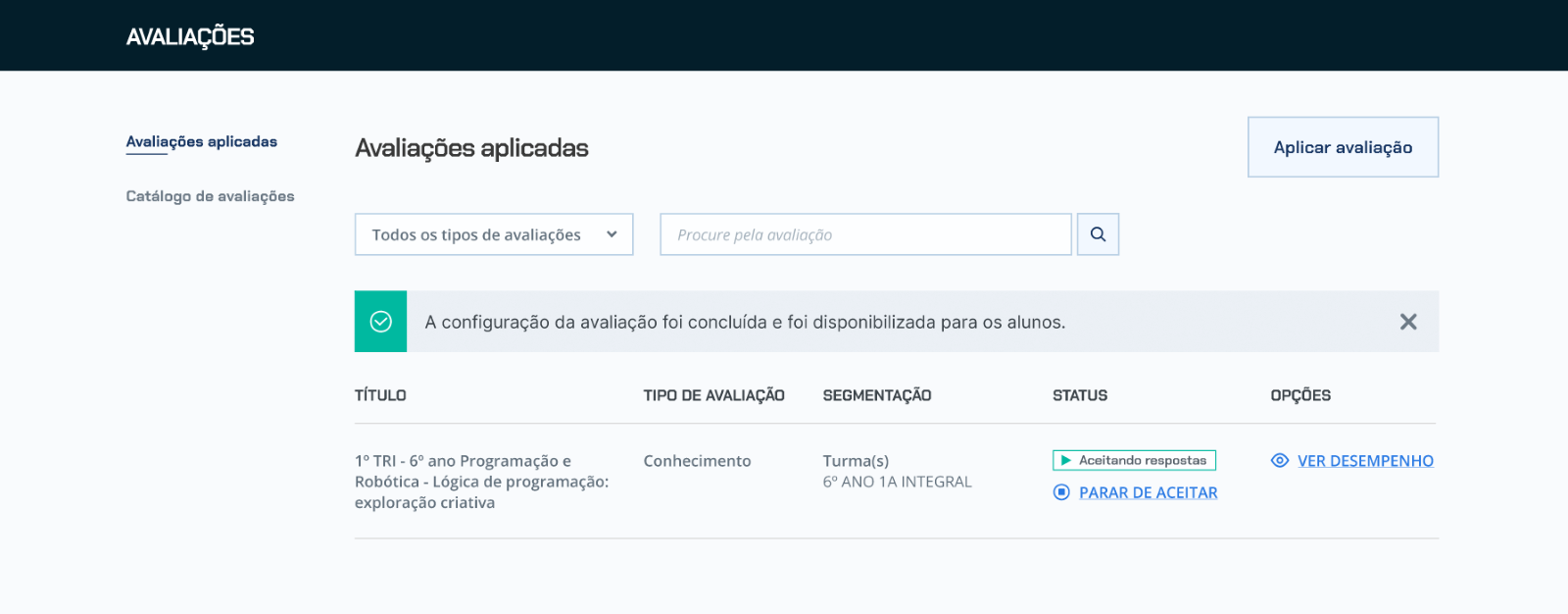 Em seguida, no menu “Avaliações aplicadas”, aparecerá as avaliações ativas com as respectivas turmas selecionadas, bem como a opção de alterar o status da prova.