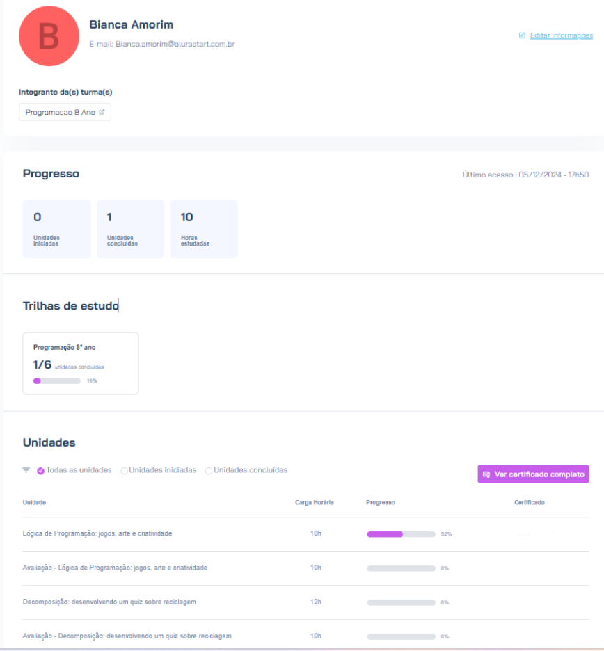 Além disso, é possível acompanhar seu progresso, incluindo dados de acesso, andamento nas trilhas de estudo e unidades, além do acesso aos certificados;