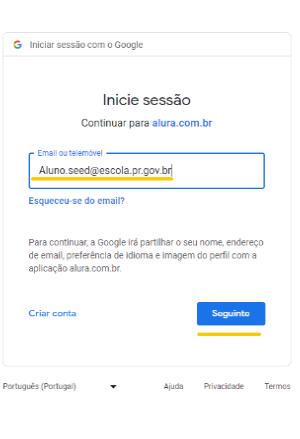 Depois, selecione a sua conta @escola.pr.gov.br , sendo a mesma que você utiliza para entrar no seu e-mail da escola ou Google Classroom: