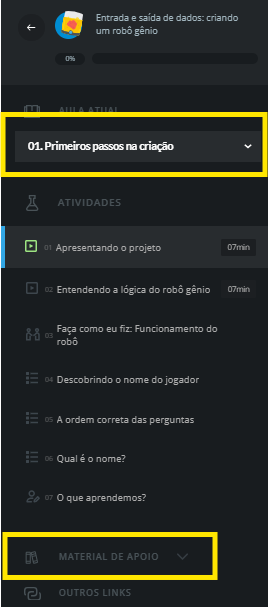 2 - Os materiais são disponibilizados aula a aula, então selecione a aula desejada e você verá a opção “Material de Apoio”;