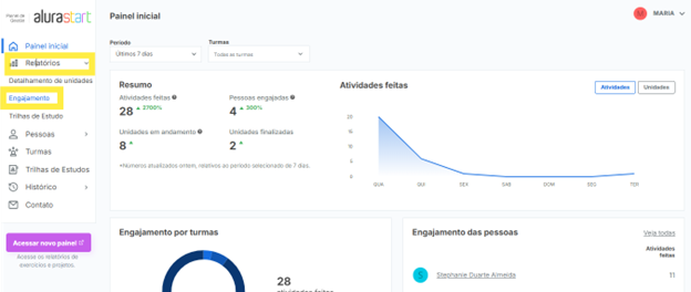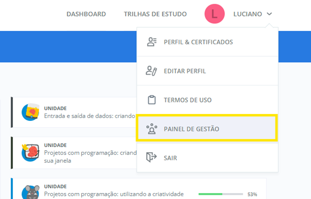 Você pode acessar os Relatórios de Engajamento e acompanhar o progresso de seus estudantes através do Painel de Gestão ao seguir os passos abaixo: