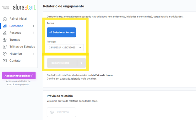 4 - Você poderá selecionar a turma e o período para o seu relatório, tendo a opção para visualizar prévia ou baixar o relatório que deseja baixar o relatório de engajamento dos estudantes.
