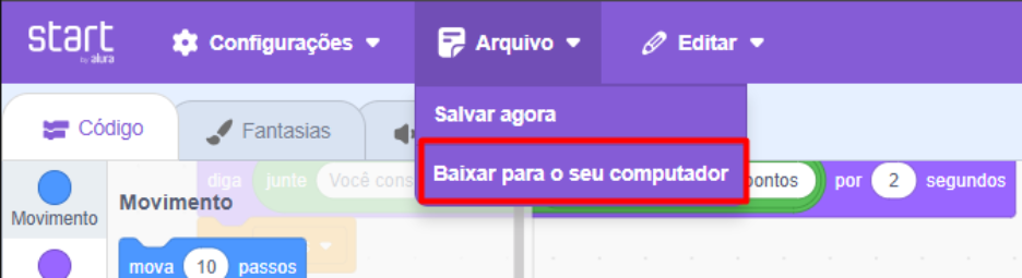 Como baixar um projeto no Startlab? Em “Arquivo”, no menu superior, clique em "Baixar para o seu computador". Em caso de dúvidas ou necessidade de suporte adicional, é possível entrar em contato com a Start aqui .
