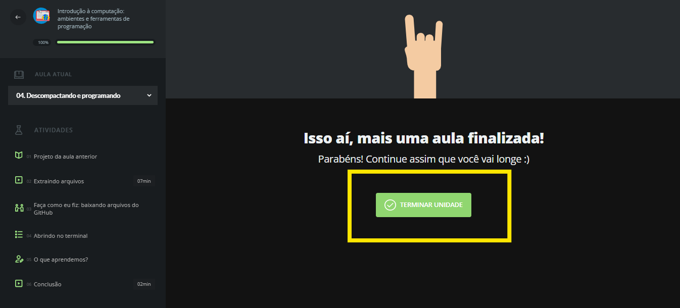 Clique em “Terminar unidade”: Esta ação deve gerar o seu certificado de conclusão.