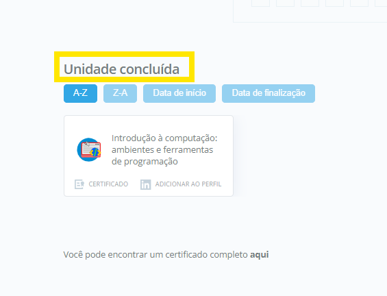Emissão do certificado: Normalmente, o certificado será gerado e estará disponível para download ou visualização na plataforma após você finalizar a unidade.