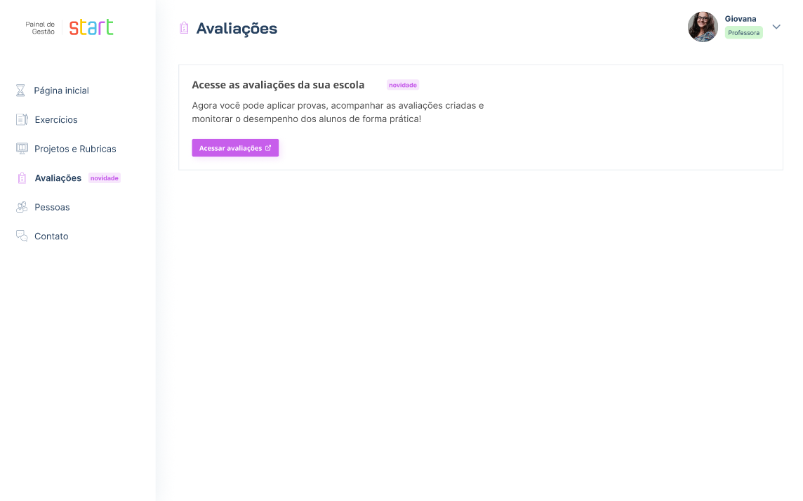 Entre no Painel de Gestão e acesse o Menu “Avaliações”. Em seguida, clique em “Acessar avaliações”.