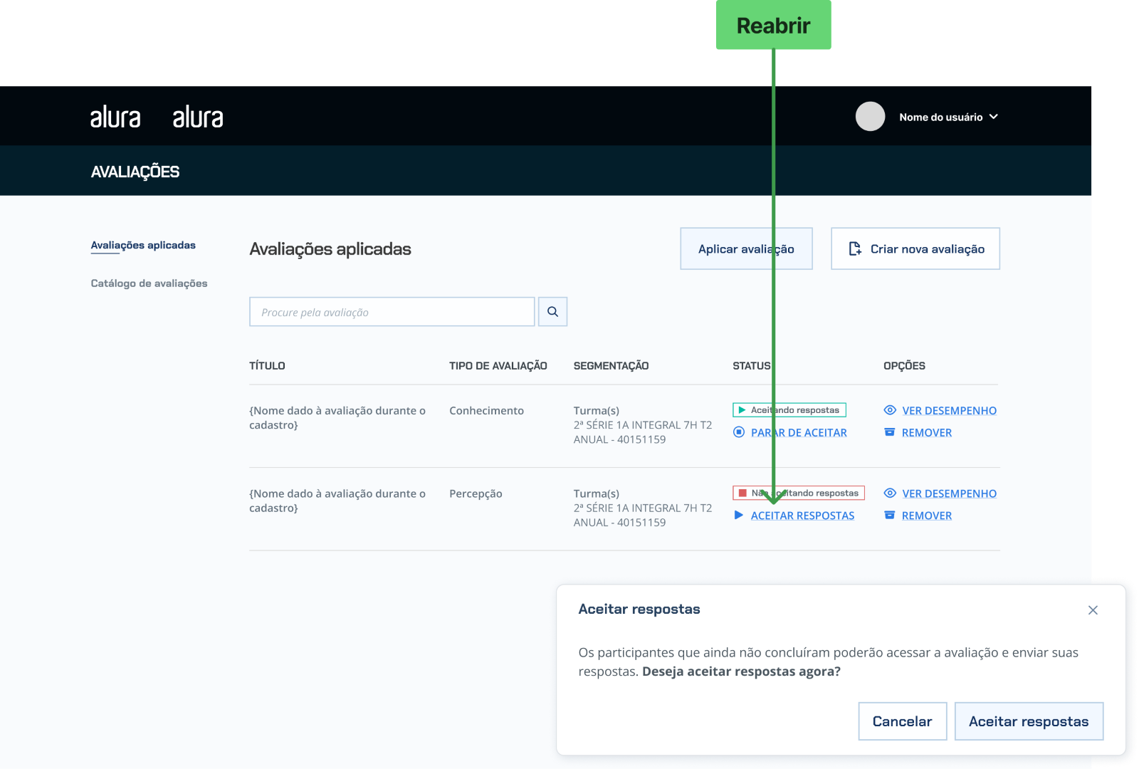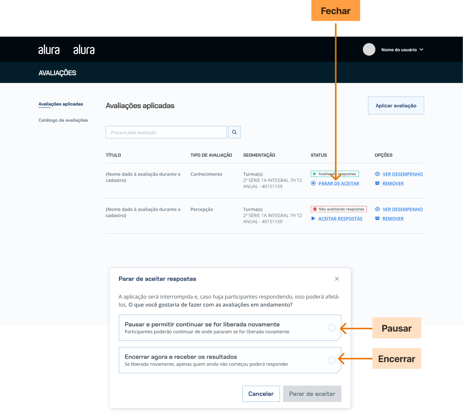Caso queira alterar os status da avaliação, é possível alterar sua disponibilidade sem precisar sair do relatório, ao clicar em “parar de aceitar”, um modal de confirmação será exibido com duas opções (obrigatório escolher uma):