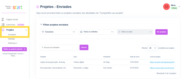 Para visualizar os projetos submetidos pelos estudantes, em seu painel de gestão, selecione a opção “Projetos” na parte superior esquerda e depois “Enviados”.