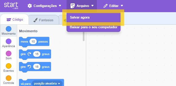 Os projetos são salvos automaticamente, mas recomendamos que o estudante clique em “Salvar agora” sempre que uma nova alteração for realizada. O atalho “Ctrl+s” também pode ser utilizado para salvar o progresso.