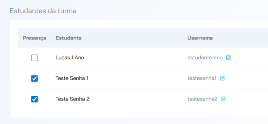 Por padrão, todos os estudantes estarão marcados. Caso algum não tenha comparecido, basta desmarcar o nome correspondente.