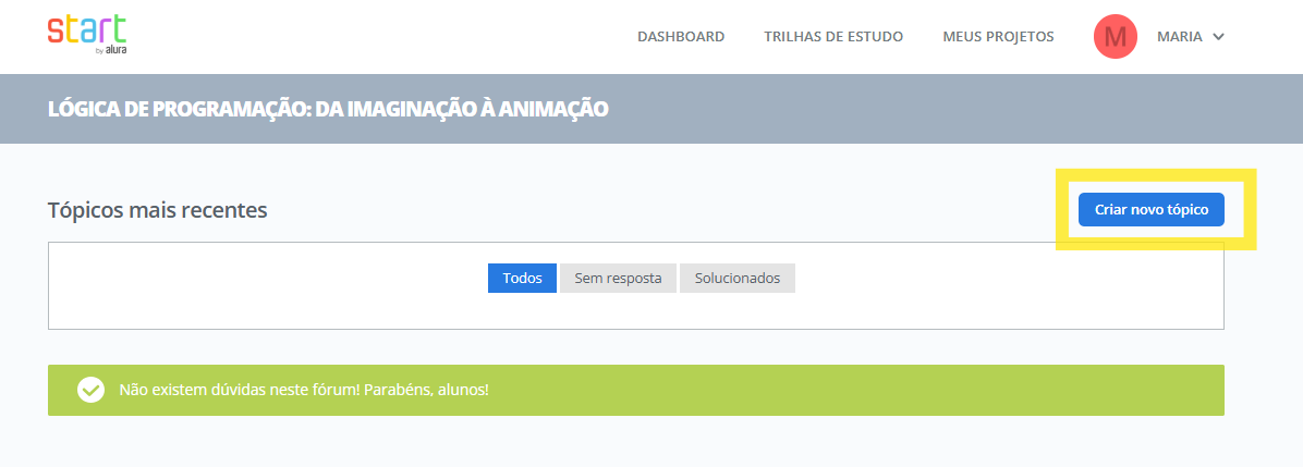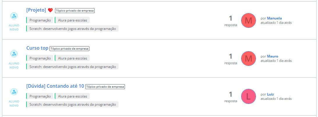 Sua dúvida será postada e poderá ser respondida por outro estudante ou por um dos nossos scubas (instrutores). Para ver se sua dúvida já foi respondida, clique no título que você deu ao post criado no fórum e na tela seguinte, verifique a resposta que foi dada.