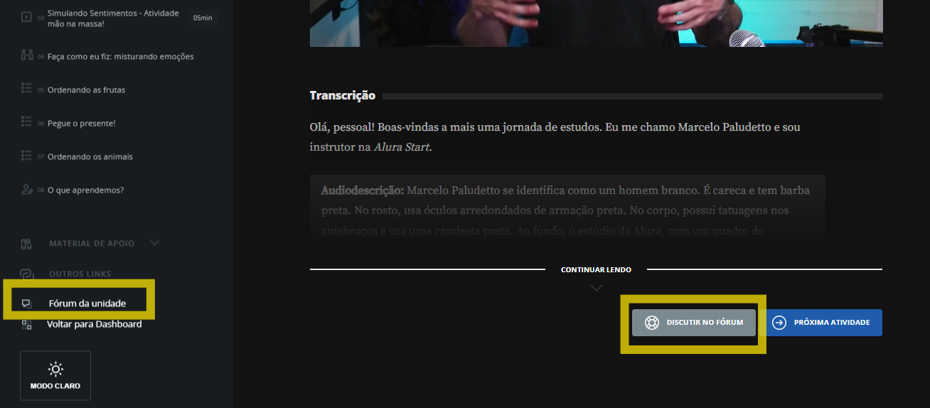 As dúvidas relacionadas ao conteúdo da unidade poderão ser postadas no campo Fórum da unidade. Ao acessar o fórum, também é possível navegar e verificar se a sua dúvida já foi postada e respondida, ou consultar outras dúvidas da unidade.