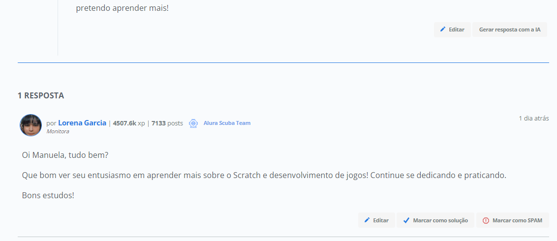 Se ainda tiver dúvidas, você poderá responder à resposta que foi dada, ou marcá-la com a opção “Marcar como solução”.