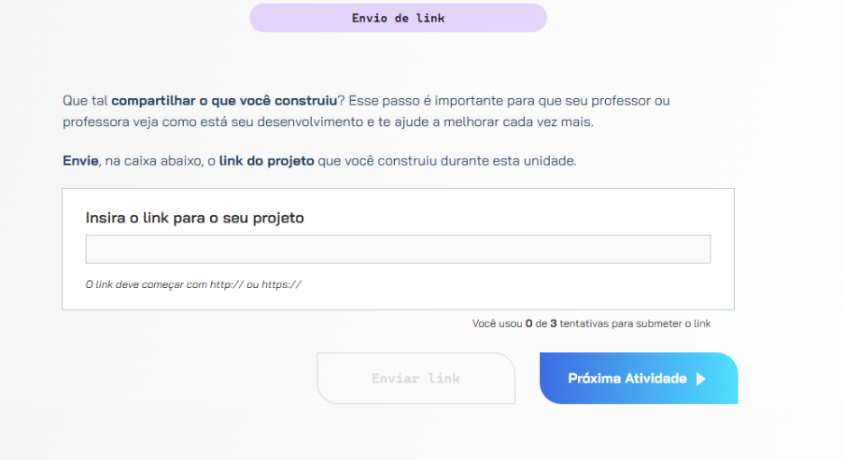 Durante a unidade, você irá criar um projeto que será compartilhado com seu professor ou professora. Para isso, é preciso enviá-lo por meio de um link no final da última aula, dentro da atividade “Envio do link”.