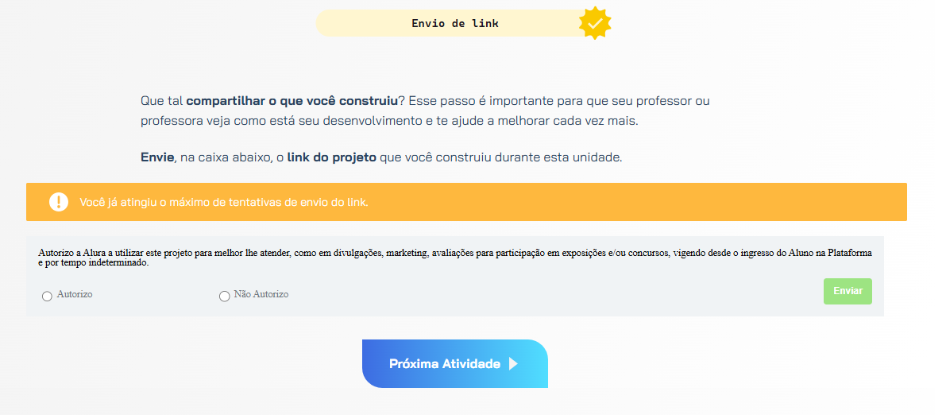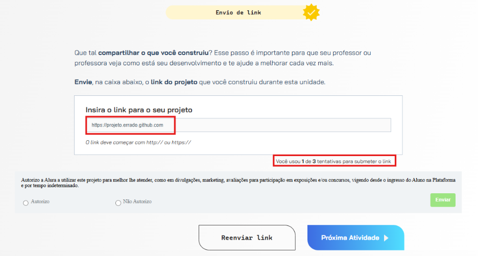 Após inserir o link é necessário autorizar e depois clicar em enviar para garantir que seu projeto seja enviado de forma eficaz.