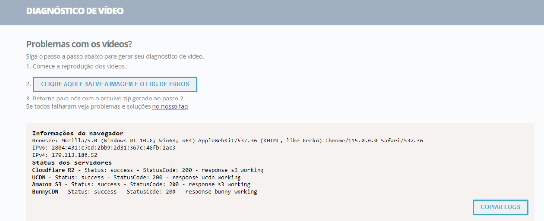 Caso o erro persista, entre em contato com o suporte da para gerar um diagnóstico de vídeo.