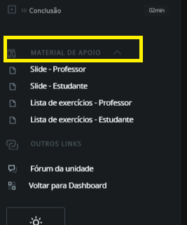 Para verificá-los, basta acessar o curso e buscar no menu a esquerda a opção do "Material de Apoio", expandindo a seta ao lado do título para abrir ou fechar a opção, conforme imagem abaixo: