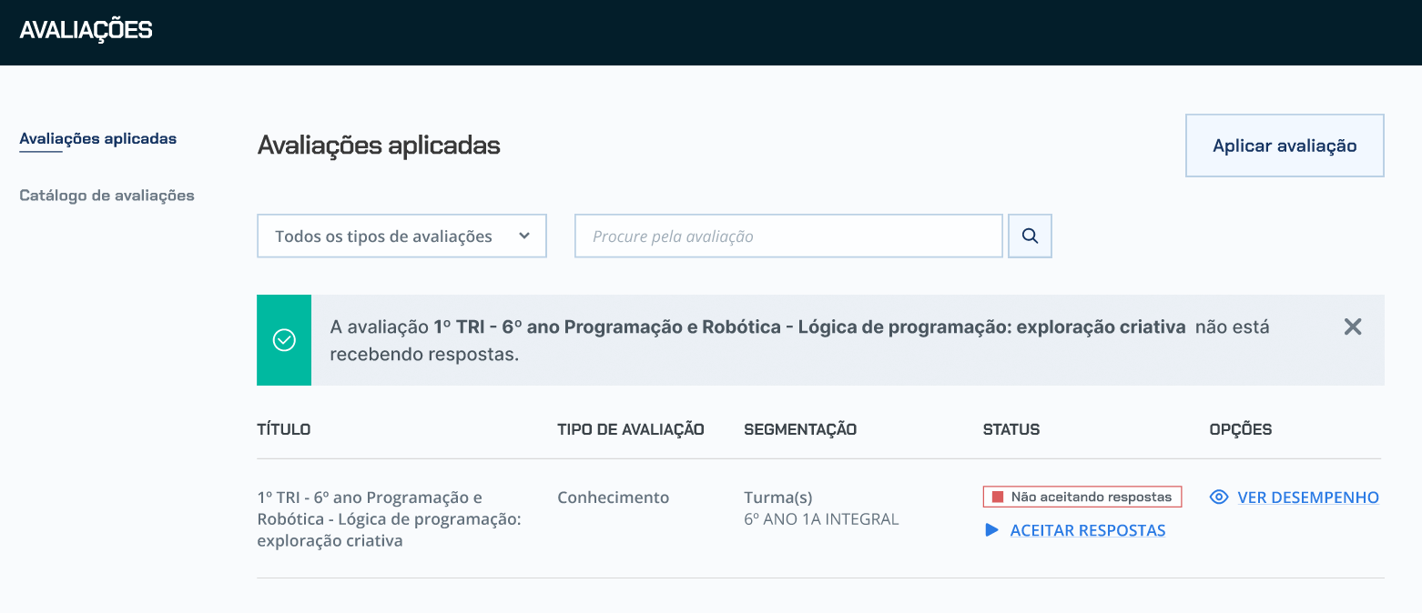 A avaliação pode ser liberada novamente no painel de gestão, em “Avaliações aplicadas” e aparecerá para todos os estudantes da turma que não iniciaram a avaliação. Para isso, basta clicar em 'Aceitar respostas' na aplicação.